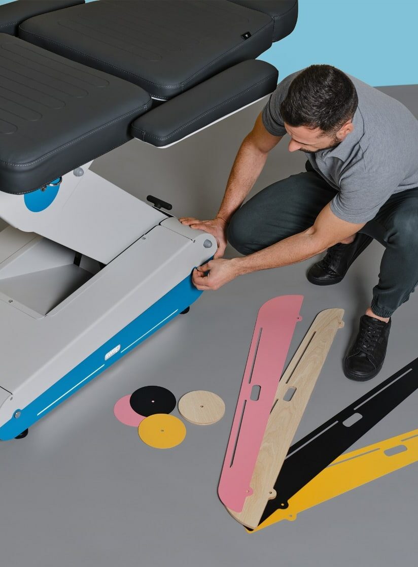 Weil man jeden Tag anders drauf ist! Beleuchten Sie Ihren Arbeitsplatz mit Licht und Farben. Tauschen Sie die Dekorleisten superschnell aus und Sie haben eine andere Liege. Wählen Sie den Cromo-Modus und die Basis leuchtet mit mehrfarbigen Lichtern. Eine professionelle High-Tech Therapieliege muss nicht langweilig sein