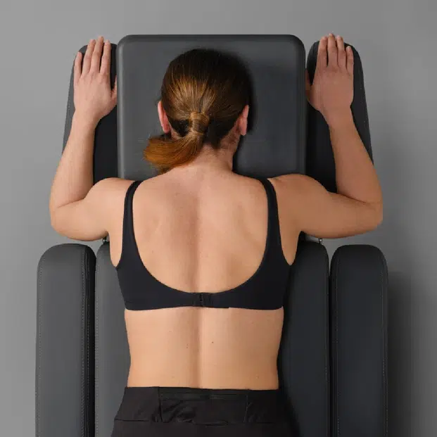 Ergonomische Armstützen, die eine optimale Position des Patienten in Bauchlage gewährleisten. Patentiertes Betriebssystem, das durch Gasdruckfeder und Hebel vollständig verstellt wird. Die Armstützen können vom Patienten selbst ohne voreingestellte Positionen sehr leichtgängig abgesenkt und angehoben werden. Der Mechanismus kollidiert nicht mit dem Therapeuten, wenn er mit einem Hocker auf dem Kopfstützenbereich sitzt.